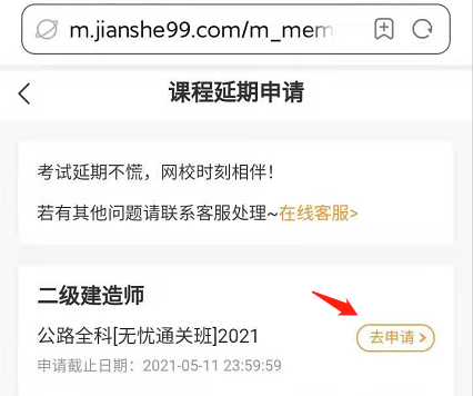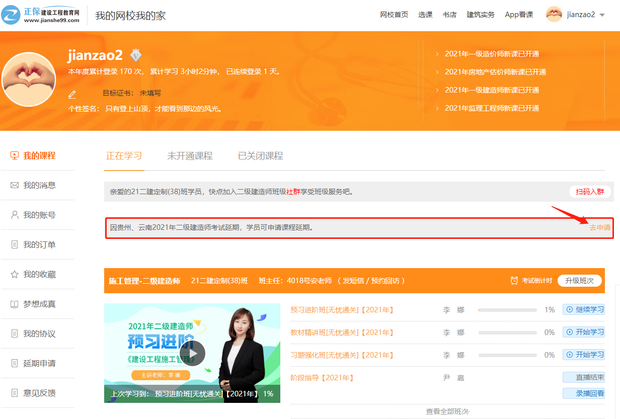 之前已經(jīng)報名網(wǎng)校2021年二級建造師考試課程的貴州、云南地區(qū)二建學(xué)員,可以申請課程延期了,入口在“我的網(wǎng)校我的家”,請大家及時申請,不要錯過。