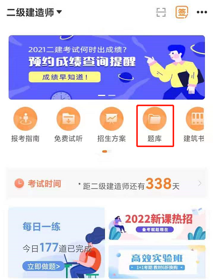 1、登錄建設(shè)工程教育網(wǎng)APP首頁,選擇“二級建造師”,找到“題庫”。