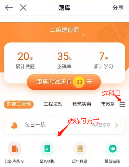 2、進入題庫,選擇考試科目和練習(xí)方式。