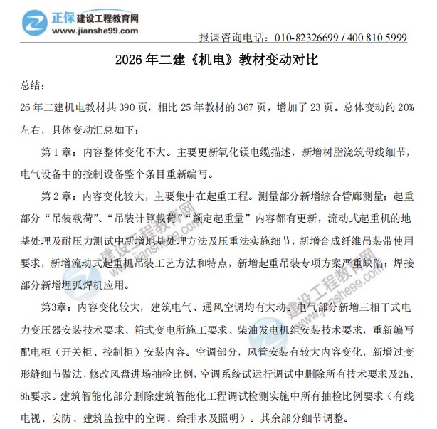 2026二建《機(jī)電實(shí)務(wù)》新教材變動(dòng)出爐!教材變動(dòng)約20%