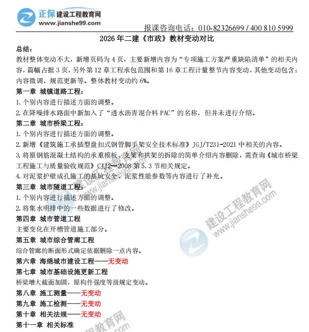 2026年二級建造師《市政實務》新教材變動梳理出爐!建設(shè)工程教育網(wǎng)教務團隊拿到教材后第一時間為大家梳理變動詳細內(nèi)容,經(jīng)核對,2026年市政實務科目整體變動約6%,教材變動內(nèi)容如下,更多變動解讀請關(guān)注8月27日19:00田洋老師直播間!