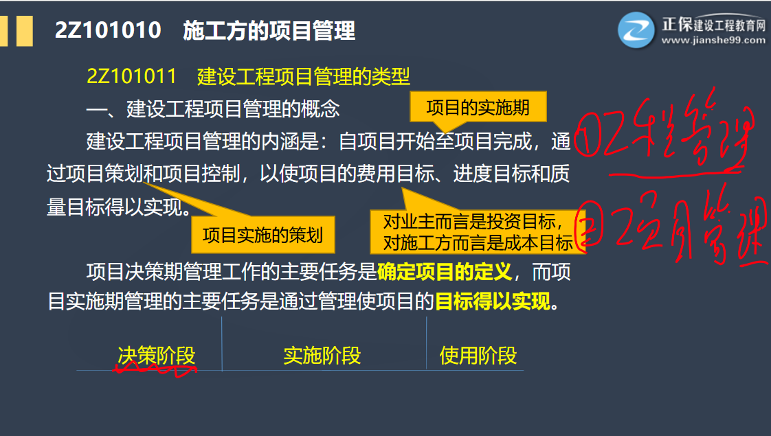 建設(shè)工程項目管理概念-建設(shè)工程項目管理的內(nèi)涵是:自項目開始至項目完成,通過項目策劃和項目控制,以使項目的費用目標(biāo)、進度目標(biāo)和質(zhì)量目標(biāo)得以實現(xiàn)。