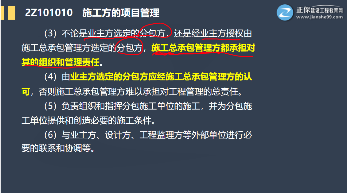 (3)不論是業(yè)主方選定的分包方,還是經(jīng)業(yè)主方授權(quán)由施工總承包方選定的分包方,施工總承包管理方都承擔(dān)對(duì)其的組織和管理責(zé)任。