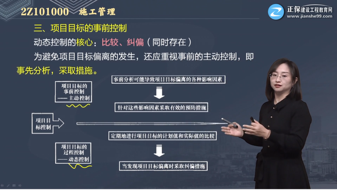 【解析】本題考察的是項(xiàng)目目標(biāo)的事前控制。項(xiàng)目目標(biāo)動(dòng)態(tài)控制的核心是,在項(xiàng)目實(shí)施的過程中定期地進(jìn)行項(xiàng)目目標(biāo)的計(jì)劃值和實(shí)際值的比較,當(dāng)發(fā)現(xiàn)項(xiàng)目目標(biāo)偏離時(shí)采取糾錯(cuò)措施。