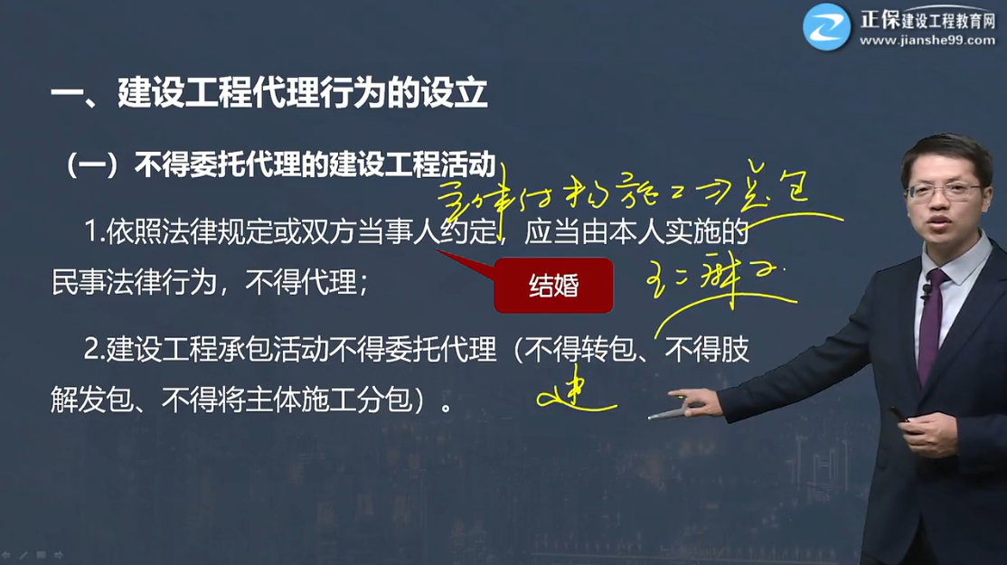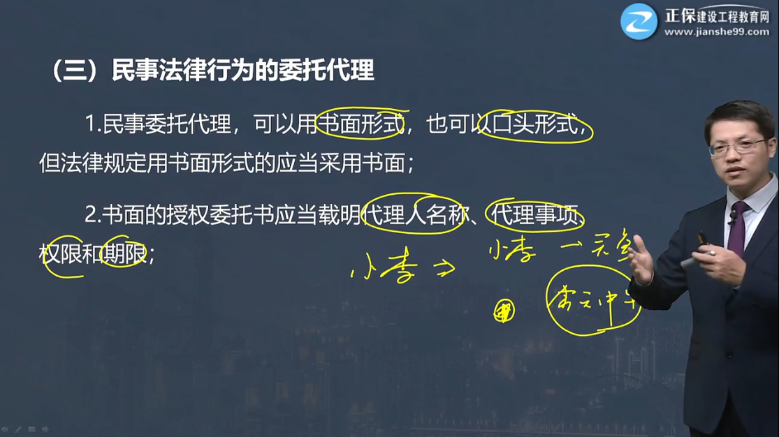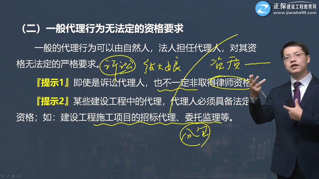 【提示2】某些建設(shè)工程中的代理,代理人必須具備法定資格;如:建設(shè)工程施工項目的招標代理、委托監(jiān)理等。
