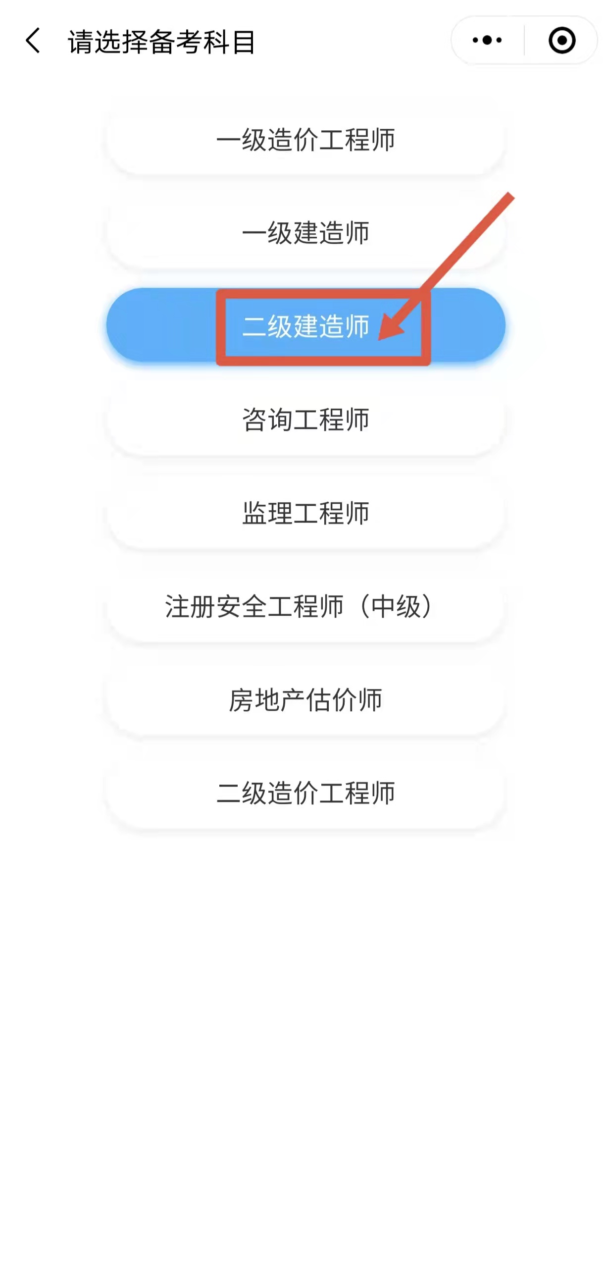 2、點擊圖一左上角標(biāo)記處,跳轉(zhuǎn)至圖二(如下圖所示),選擇“二級建造師”;