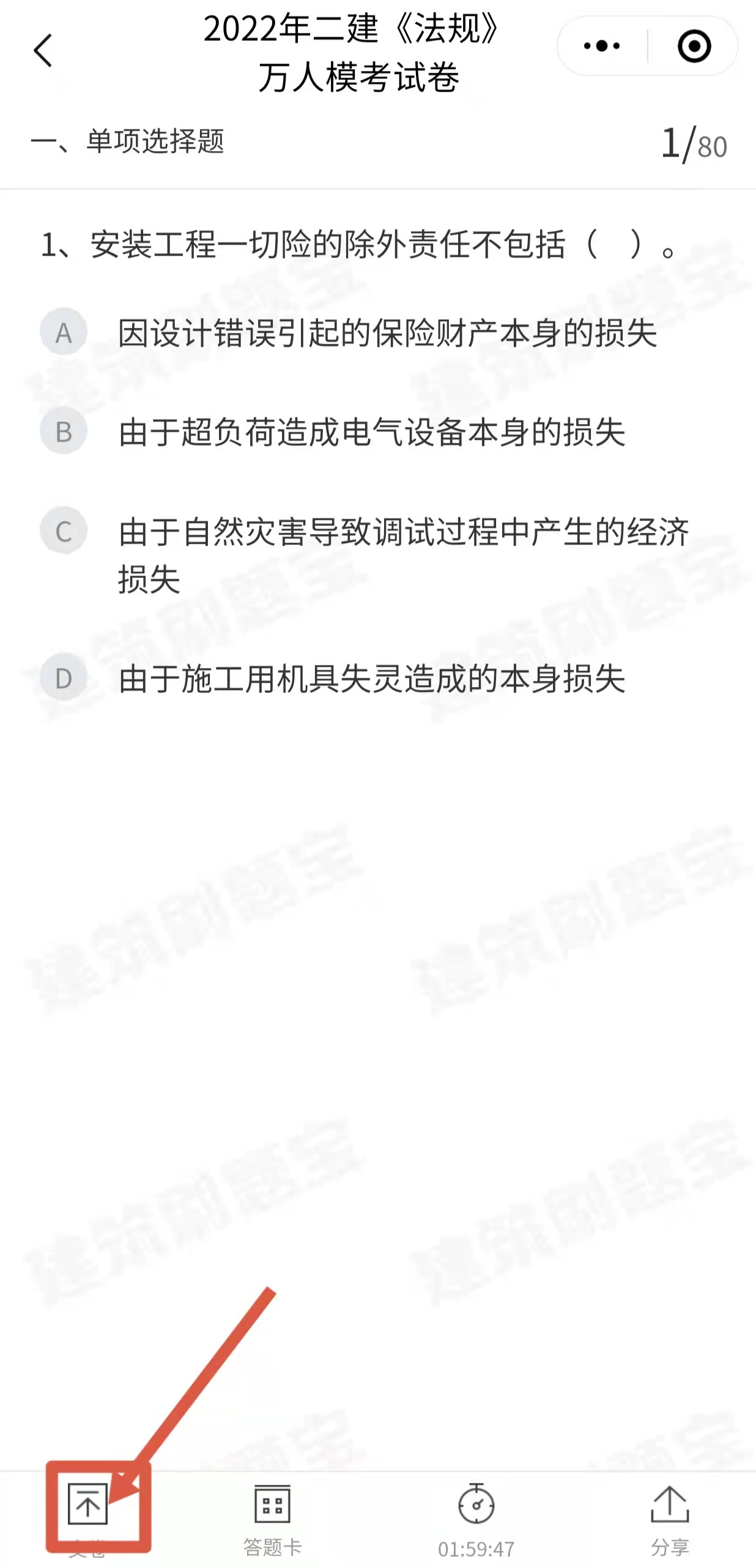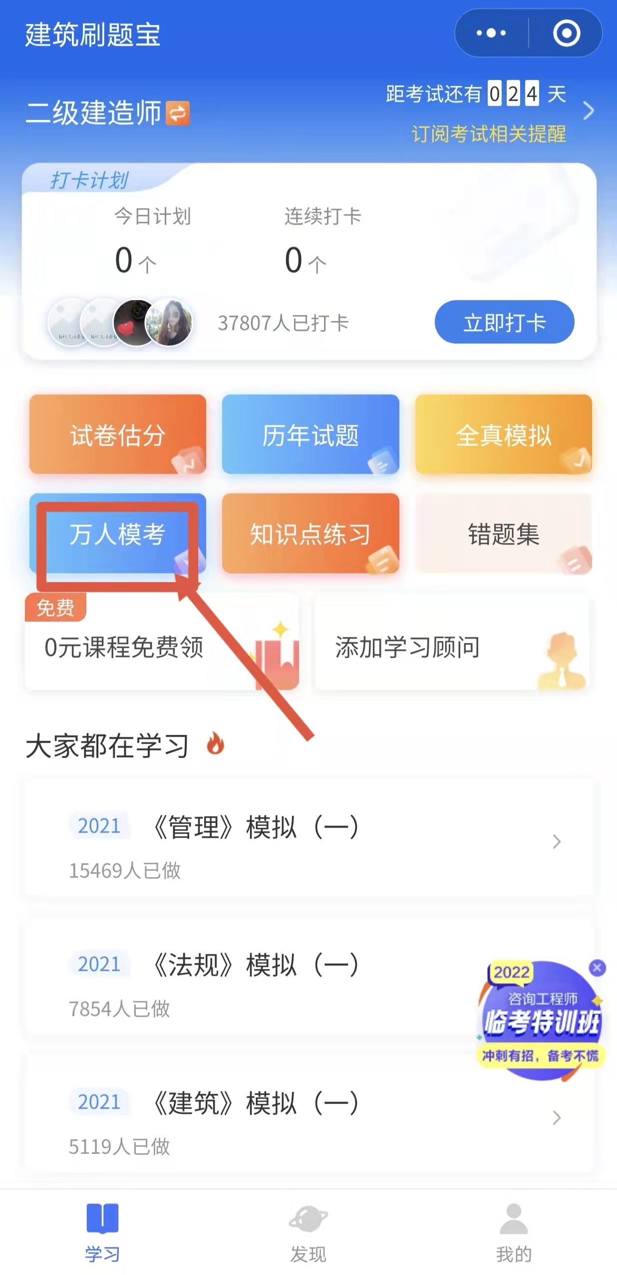 掃碼進入建筑刷題寶——選擇二級建造師——萬人模考,點擊即可直接進入模考中心。
