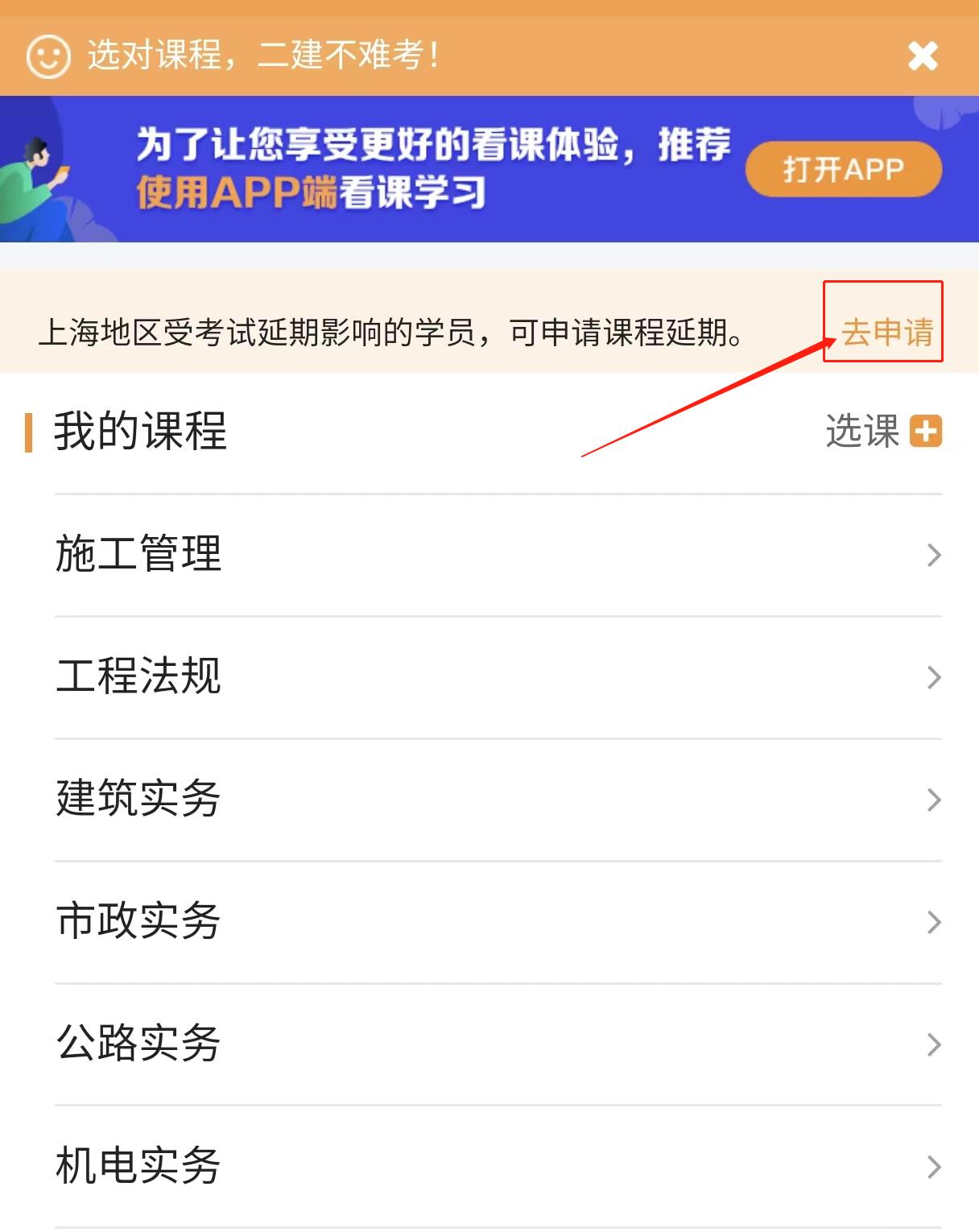 之前在網(wǎng)校報(bào)過(guò)2022年二級(jí)建造師課程的上??紖^(qū)的同學(xué),可以申請(qǐng)課程延期,申請(qǐng)時(shí)間為:4月27日-5月31日,入口在“我的網(wǎng)校我的家”,同學(xué)們及時(shí)提交申請(qǐng),不要錯(cuò)過(guò)了時(shí)間。