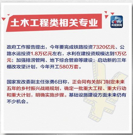 政府工作報告中指出2018年要完成鐵路、公路、水利等近3萬億元,基礎(chǔ)設(shè)施方面仍有不少機會。央視新聞同時點出土木工程類專業(yè),可謂是建筑人的福音,建筑產(chǎn)業(yè)位置依然牢不可撼。