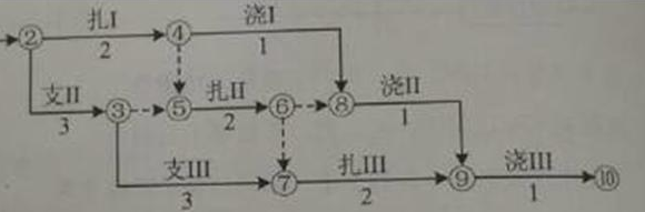某鋼筋混凝土基礎(chǔ)工程,包括支模板、綁扎鋼筋、澆筑混凝土三道工序,每道工序安排一個(gè)專業(yè)施工隊(duì)進(jìn)行,分三段施工,各工序在一個(gè)施工段上的作業(yè)時(shí)間分別3天、2天、1天,關(guān)于其施工網(wǎng)絡(luò)計(jì)劃的說法,正確的有( )。