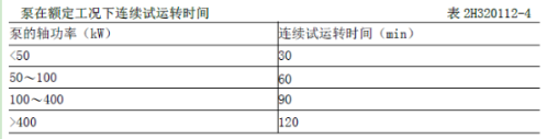 (7)泵在額定工況下連續(xù)試運(yùn)轉(zhuǎn)時(shí)間不應(yīng)少于表2H320112-4 規(guī)定的時(shí)間;高速泵及特殊要求的泵試運(yùn)轉(zhuǎn)時(shí)間應(yīng)符合隨機(jī)技術(shù)文件的規(guī)定。