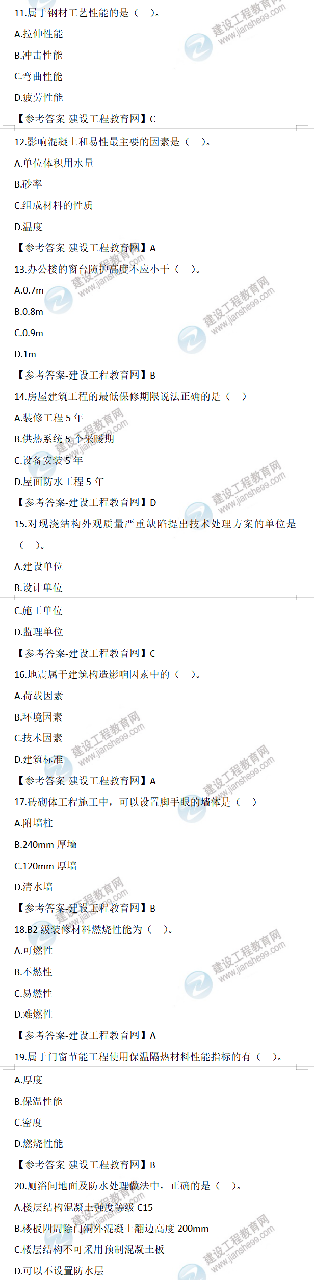 2022年二級建造師建筑工程實務(wù)試題及答案第11-20題(6月11日)