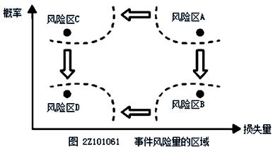 答案解析:本題考查的是風(fēng)險(xiǎn)和風(fēng)險(xiǎn)量的內(nèi)涵。若某事件經(jīng)過(guò)風(fēng)險(xiǎn)評(píng)估,它處于風(fēng)險(xiǎn)區(qū)A,則應(yīng)采取措施,降低其概率,以使它移位至風(fēng)險(xiǎn)區(qū)B;或采取措施降低其損失量,以使它移位至風(fēng)險(xiǎn)區(qū)C。風(fēng)險(xiǎn)區(qū)B和C的事件則應(yīng)采取措施,使其移位至風(fēng)險(xiǎn)區(qū)D。