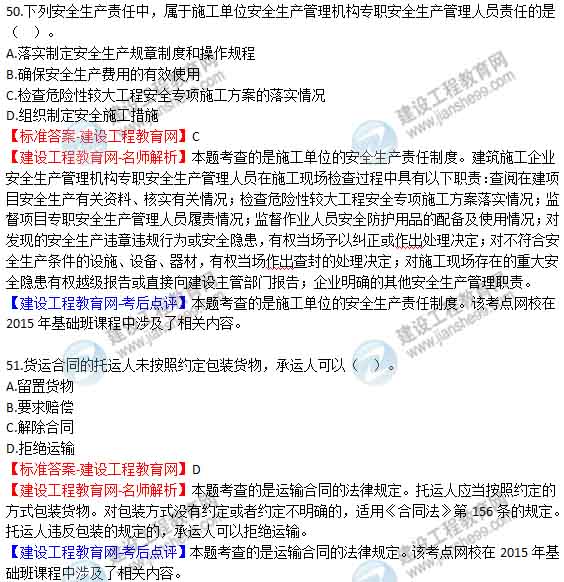 2015年二級建造師《建設工程法規(guī)及相關知識》答案及解析由老師整理而成,部分網(wǎng)站未經(jīng)許可擅自轉載、抄襲,造成內容有所缺失或錯誤,請大家以建設工程教育網(wǎng)發(fā)布為準!二建試題答案