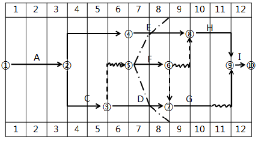 在施工組織設計中,施工進度計劃以時標網(wǎng)絡圖(時間單位:月)形式表示。在第8個月末,施工單位對現(xiàn)場實際進度進行檢查,并在時標網(wǎng)絡圖中繪制了實際進度前鋒線,如下圖所示:
