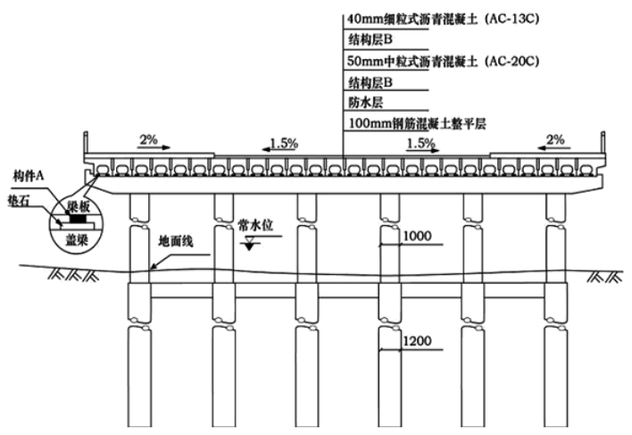 1.寫出圖1中構(gòu)件A和橋面鋪裝結(jié)構(gòu)層B的名稱,并說明構(gòu)件A在橋梁結(jié)構(gòu)中的作用。