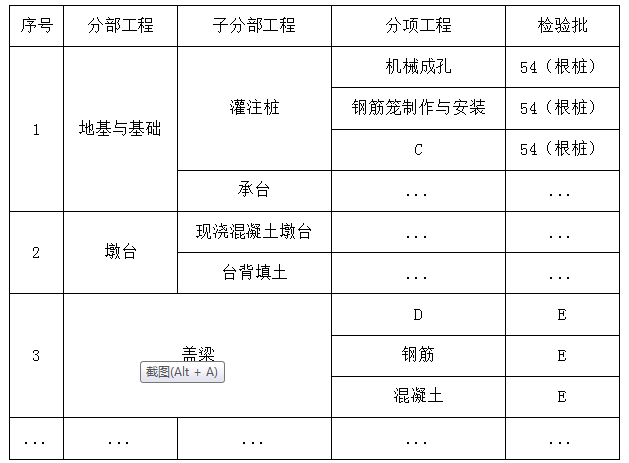 表1 橋梁分部(子分部)、分項工程及檢驗批對照表(節(jié)選)