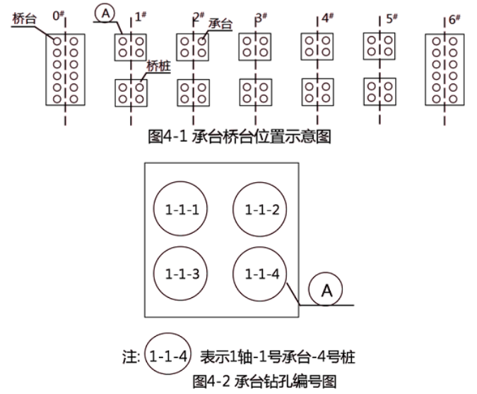 某公司項目部施工的橋梁基礎(chǔ)工程,灌注樁混凝土強度為C25,直徑1200mm,樁長18m,承臺、橋臺的位置如圖4-1所示,承臺的樁位編號如圖4-2所示。
