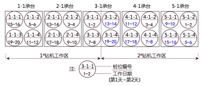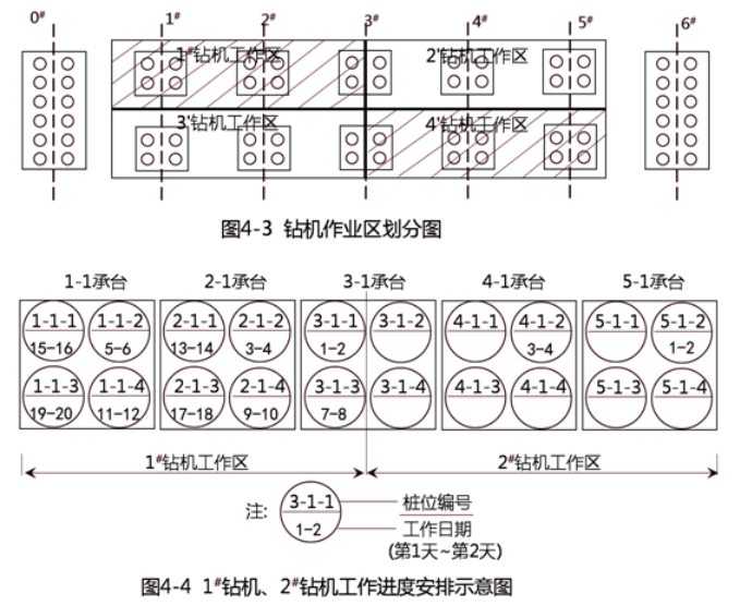 事件一:項目部依據(jù)工程地質(zhì)條件,安排4臺反循環(huán)鉆機同時作業(yè),鉆機工作效率(1根樁/2d)。在前12天,完成了橋臺的24根樁,后20天要完成10個承臺的40根樁。承臺施工前項目部對4臺鉆機作業(yè)劃分了區(qū)域,見圖4-3,并提出了要求:①每臺鉆機完成10根樁;②一座承臺只能安排1臺鉆機作業(yè);③同一承臺兩樁施工間隙時間為2天。1#鉆機工作進度安排及2#鉆機部分工作進度安排如圖4-4所示。