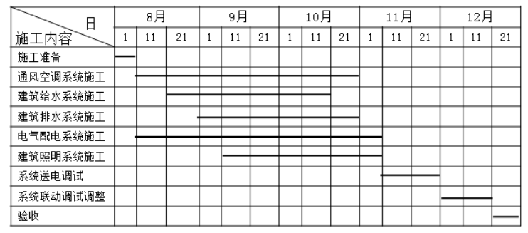 A安裝公司項目部在8月1日進場后,依據(jù)B建筑公司的施工進度,空調(diào)設備的到場時間及供電所的送電時間等資料,編制了通風空調(diào)、給排水和建筑電氣工程的施工進度計劃(見表3),該施工進度計劃在送審時,被總工程師否定,經(jīng)項目部修改后通過審批。