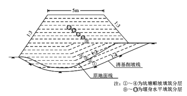 2.堰基坑塘部位削坡至1∶4不妥,應(yīng)削至緩于1∶5。堰基坑塘部位順坡分層填筑不妥,應(yīng)水平分層填筑。