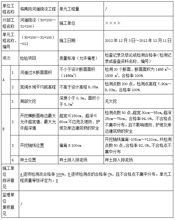 表4 河道疏浚單元工程施工質(zhì)量驗收評定表