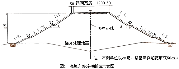 某施工單位承建了一段二級(jí)公路路基工程,其中K3+220~K3+650為高填方路堤。路基填方高度最高為21.2m,地面以下有約6m的軟土層。施工單位采用強(qiáng)夯處理地基,采用水平分層填筑路堤。高填方路堤橫斷面示意圖如圖1所示。