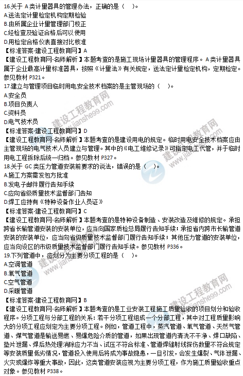 2019年二級建造師機(jī)電實(shí)務(wù)單選題16-20試題及答案解析