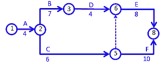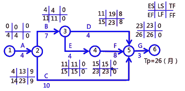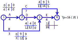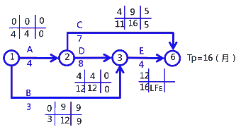 施工項(xiàng)目部編制了施工進(jìn)度計(jì)劃雙代號網(wǎng)絡(luò)圖,如下(單位:月)
