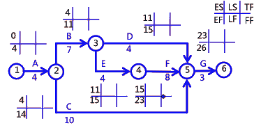 ?、侔凑諒钠瘘c(diǎn)向終點(diǎn)順序逐個(gè)計(jì)算每項(xiàng)工作的ES,EF