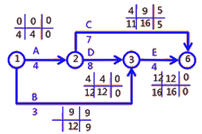 建設(shè)單位不施工單位簽訂了施工承包合同,合同工期16個(gè)月,施工項(xiàng)目部編制了施工進(jìn)度計(jì)劃雙代號網(wǎng)絡(luò)圖。如下(單位:月)。