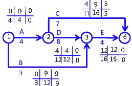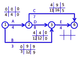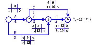 某住宅工程,磚混結(jié)構(gòu),地上7層。施工項(xiàng)目部將整個(gè)施工任務(wù)劃分成5個(gè)工作(A、B、C、D、E)。編制了施工進(jìn)度計(jì)劃雙代號網(wǎng)絡(luò)圖如下(單位:月)