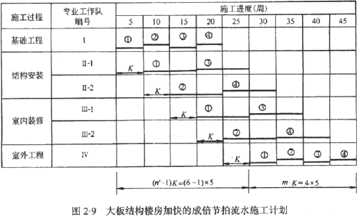 某建設(shè)工程由四幢大板結(jié)構(gòu)樓房組成,每幢樓房為一個施工段,施工過程劃分為基礎(chǔ)工程、結(jié)構(gòu)安裝、室內(nèi)裝修和室外工程4項(xiàng),其流水節(jié)拍分別為:5周、10周、10周、5周。一般的成倍節(jié)拍流水施工進(jìn)度計(jì)劃如圖2—8所示。