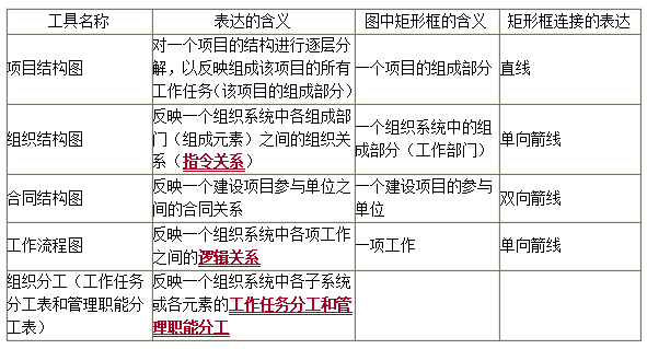 考點:項目結(jié)構(gòu)圖、組織結(jié)構(gòu)圖、合同結(jié)構(gòu)圖、工作流程圖、組織分工表(管理任務(wù)分工表和管理職能分工表)對照: