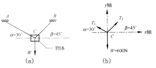 一個物體,重量為w,通過兩條繩索AC和BC吊著,計算AC.BC拉力的步驟為: