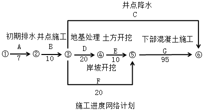 承包人承擔(dān)某水閘工程施工,編制的施工總進(jìn)度計(jì)劃中相關(guān)工作如下:①場(chǎng)內(nèi)道路,②水閘主體施工,③圍堰填筑,④井點(diǎn)降水,⑤材料倉庫,⑥基坑開挖,⑦地基處理,⑧辦公、生活用房等。監(jiān)理工程師批準(zhǔn)了該施工總進(jìn)度計(jì)劃。其中部分工程施工網(wǎng)絡(luò)進(jìn)度計(jì)劃如下圖所示(單位:天)。