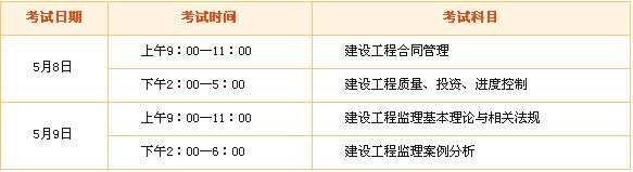 考試分4個(gè)半天進(jìn)行,《工程建設(shè)合同管理》、《工程建設(shè)監(jiān)理基本理論與相關(guān)法規(guī)》的考試時(shí)間為2個(gè)小時(shí);《工程建設(shè)質(zhì)量、投資、進(jìn)度控制》的考試時(shí)間為3個(gè)小時(shí);《工程建設(shè)監(jiān)理案例分析》的考試時(shí)間為4個(gè)小時(shí)。