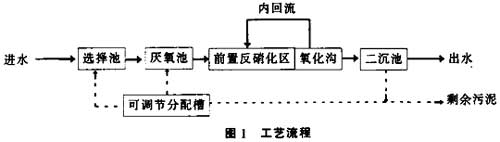 、圻M水中的BOD是作為營養(yǎng)物質(zhì)供給聚磷菌活動的基質(zhì),故m(BOD)/m(TP)是衡量能否達到除磷的重要指標,一般認為該值大于20,比值越大,除磷效果越明顯。本工程m(BOD)/m(TP)=30-45,可采用生物除磷工藝。處理工藝流程見圖1。
