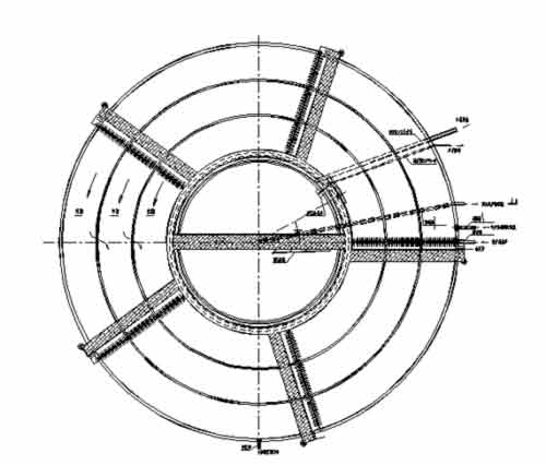 但應(yīng)該看到,對(duì)于山區(qū)用地緊張的重慶庫區(qū)其占地偏大也是引人注目的缺點(diǎn)。由于氧化溝為圓形或橢圓形溝型,加上池中心設(shè)有中心島,造成氧化溝占地較大,平面布置相對(duì)困難;另外設(shè)置的輻流式沉淀池亦為圓形,使得廠區(qū)無效占地比例偏高。設(shè)計(jì)立足從盡量減少無效占地的角度對(duì)典型的ORBAL工藝氧化溝與二沉池分建的工藝進(jìn)行了優(yōu)化,引進(jìn)U.S.FILTER公司技術(shù),確定氧化溝與二沉池合建方案,即二沉池外層設(shè)三圈氧化溝,呈同心布置,二沉池取代了ORBAL氧化溝中心島,具體形式見下圖。