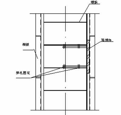 采用綁扎固定的方法:用鐵絲將預(yù)埋件錨腳與鋼筋架綁扎在一起(如下圖所示)。為了防止預(yù)埋件位移,錨腳盡量長一些。