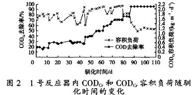 按1.3.1污泥的馴化方法,進行兩種不同的接種污泥試驗, 考察2個反應器中COD.去除率和CODo容積負荷隨時間的變化,結(jié)果如圖2、圖3所示。