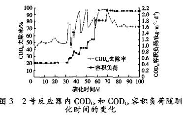根據(jù)出水CODo去除率及污泥馴化情況,逐漸增加進水有機物濃度。