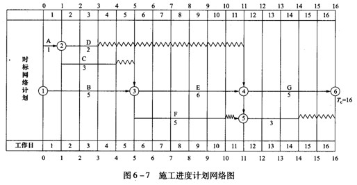 某6層住宅樓工程項目時標網絡計劃如圖6 -7所示,在工作日第5天下班后檢查施工進度完成情況,發(fā)現A工作已完成,D工作尚未開始,C工作進行2天,B工作進行3天。