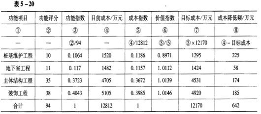 答數(shù):根據(jù)上表所列數(shù)據(jù),分別計算樁基維護(hù)工程、地下室工程、主體結(jié)構(gòu)工程和裝飾工程的功能指數(shù)、成本指數(shù)和價格指數(shù);再根據(jù)給定的總目標(biāo)成本額,計算各工程內(nèi)容的目標(biāo)成本額,從而確定其成本降低額度。具體計算結(jié)果匯總見表5-20(5分)。