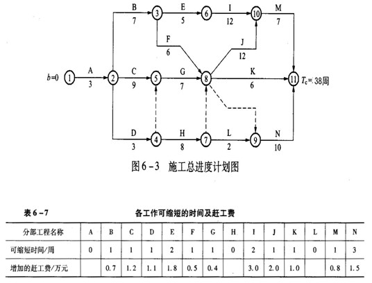 某市政工程,項(xiàng)目的合同工期為38周。經(jīng)總監(jiān)理工程師批準(zhǔn)的施工總進(jìn)度計(jì)劃如圖6-3所示(時(shí)間單位:周),各工作可以縮短的時(shí)間及其增加的趕工費(fèi)見(jiàn)表6-7,其中H、L分別為道路的路基、路面工程。