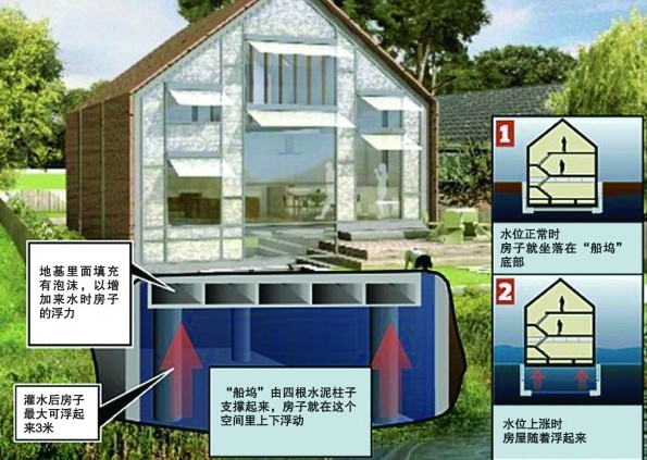 提要:英國建筑師設(shè)計出一種水陸兩棲房屋,房子建在陸地上,平時看上去與普通房屋沒兩樣,不過當?shù)叵滤簧蠞q時,用浮力材質(zhì)制造的地基就會上浮,最高可托舉房子上浮3米。