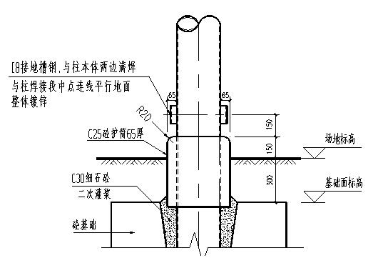 。3)基礎(chǔ)可采用現(xiàn)澆或預(yù)制后埋設(shè)的方式,圍欄內(nèi)設(shè)置150mm厚C20素混凝土地面,標(biāo)高平場(chǎng)地,按0.3%坡度坡向圍欄外;為防止積水腐蝕立柱柱腳,立柱基礎(chǔ)高出素混凝土地面100mm.