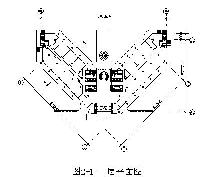 工程的建筑方案由美國××公司設計,××設計研究院負責施工圖設計,大廈主體建筑平面呈“V”型,南北長約102.7m,東西寬62.5m,建筑造型錯落有致,簡潔明快,壯觀豪華,功能齊全。建筑物檐口高度為49.7m,外墻裝飾為花崗巖、玻璃幕墻、鋁板以及石材格柵相結合組成,輔以遮陽板結構體系,加上上部結構逐層收縮的建筑處理手法,使整個建筑物既有中國傳統(tǒng)的雄偉堅實的建筑格調(diào),又具有簡潔明快的現(xiàn)代化建筑風格。其平面圖、剖面圖見附圖2-1、附圖2-2。工程具有先進的通訊系統(tǒng)、安全可靠的供電系統(tǒng)、火災自動報警系統(tǒng)、綜合布線系統(tǒng)、變頻中央空調(diào)系統(tǒng)、高低壓給水系統(tǒng)、排水系統(tǒng)以及辦公自動化系統(tǒng)等,設八部自動電梯,其中兩部為消防電梯。鍋爐共6臺,為0.6MPa全自動熱水鍋爐。通過先進的智能化樓宇集成、樓宇自控,使大廈建成為一流的現(xiàn)代化寫字樓。