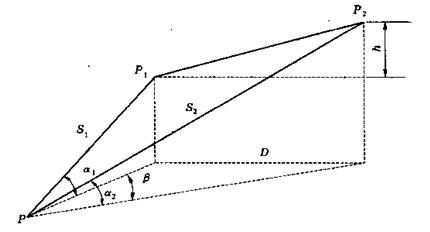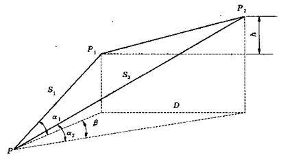 在與P1、P2通視的任一點P上安置全站儀,首先觀測P至P1、P2的斜距S1、S2,豎直角α1、α2,以及PP1至PP2間的水平夾角β,然后可由余弦公式計算P1P2的平距D和高差h: