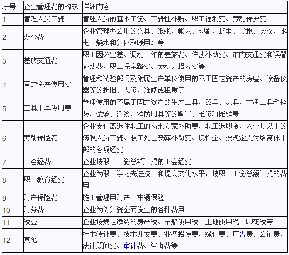 2、企業(yè)管理費,是指建筑安裝企業(yè)組織施工生產(chǎn)和經(jīng)營管理所需費用。詳細內(nèi)容見下表所示: